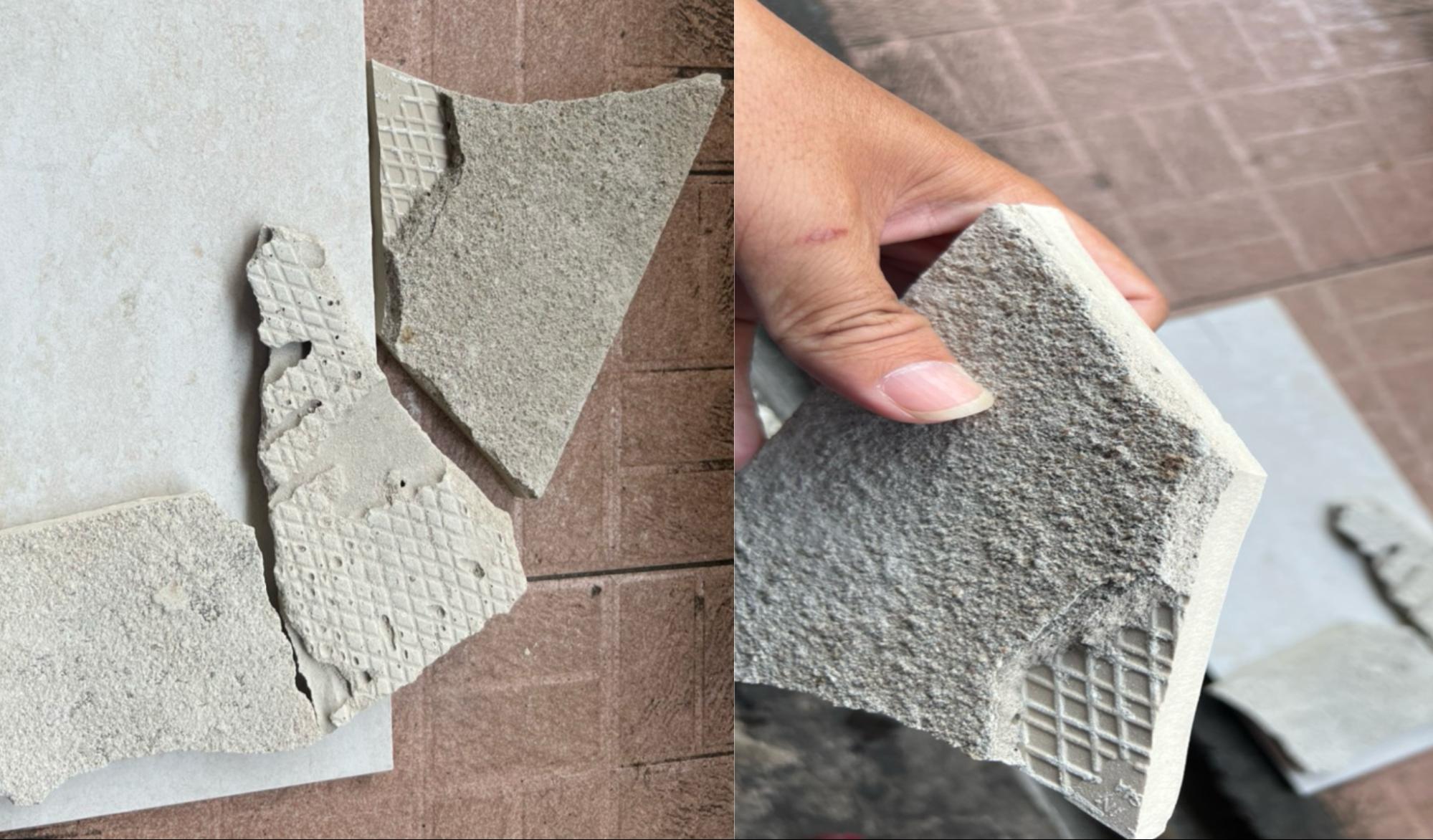 Khi phát hiện gạch bị bong tróc, khách hàng đã tiến hành đục lên và phát hiện lớp keo dán gạch hoàn toàn không bám dính với bề mặt viên gạch.